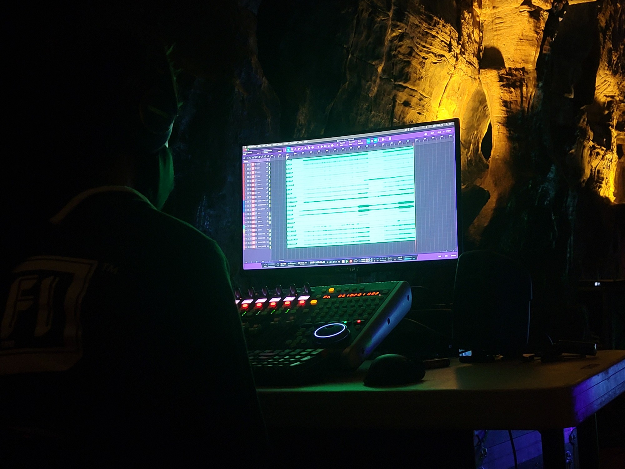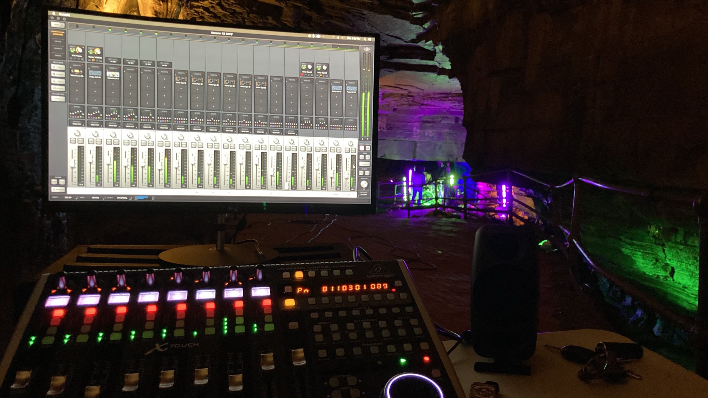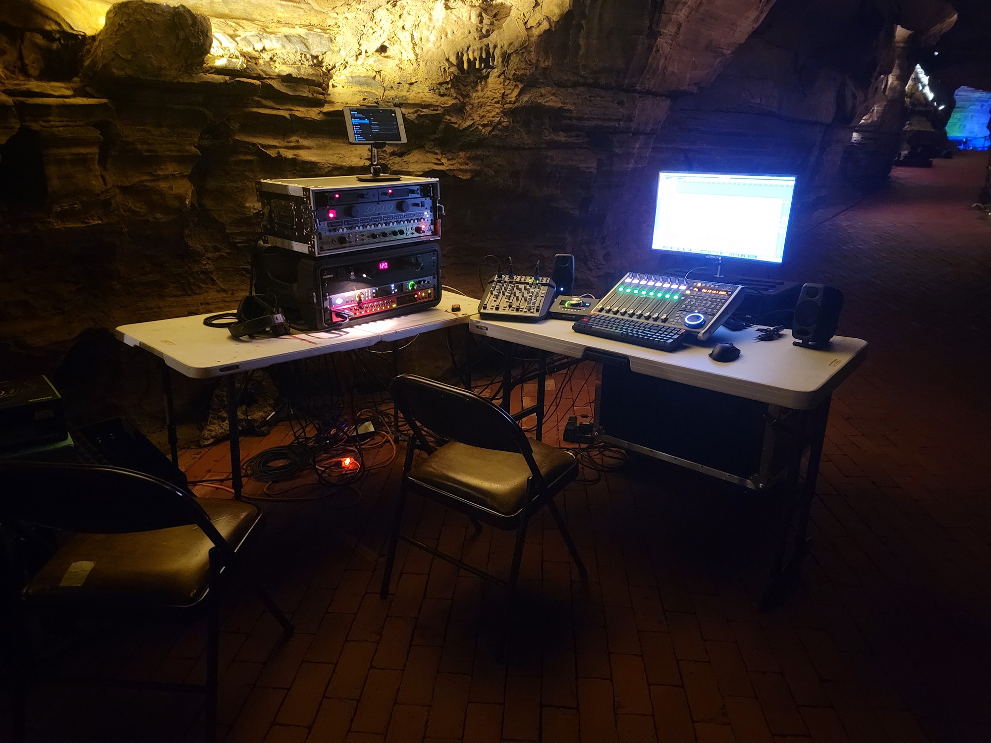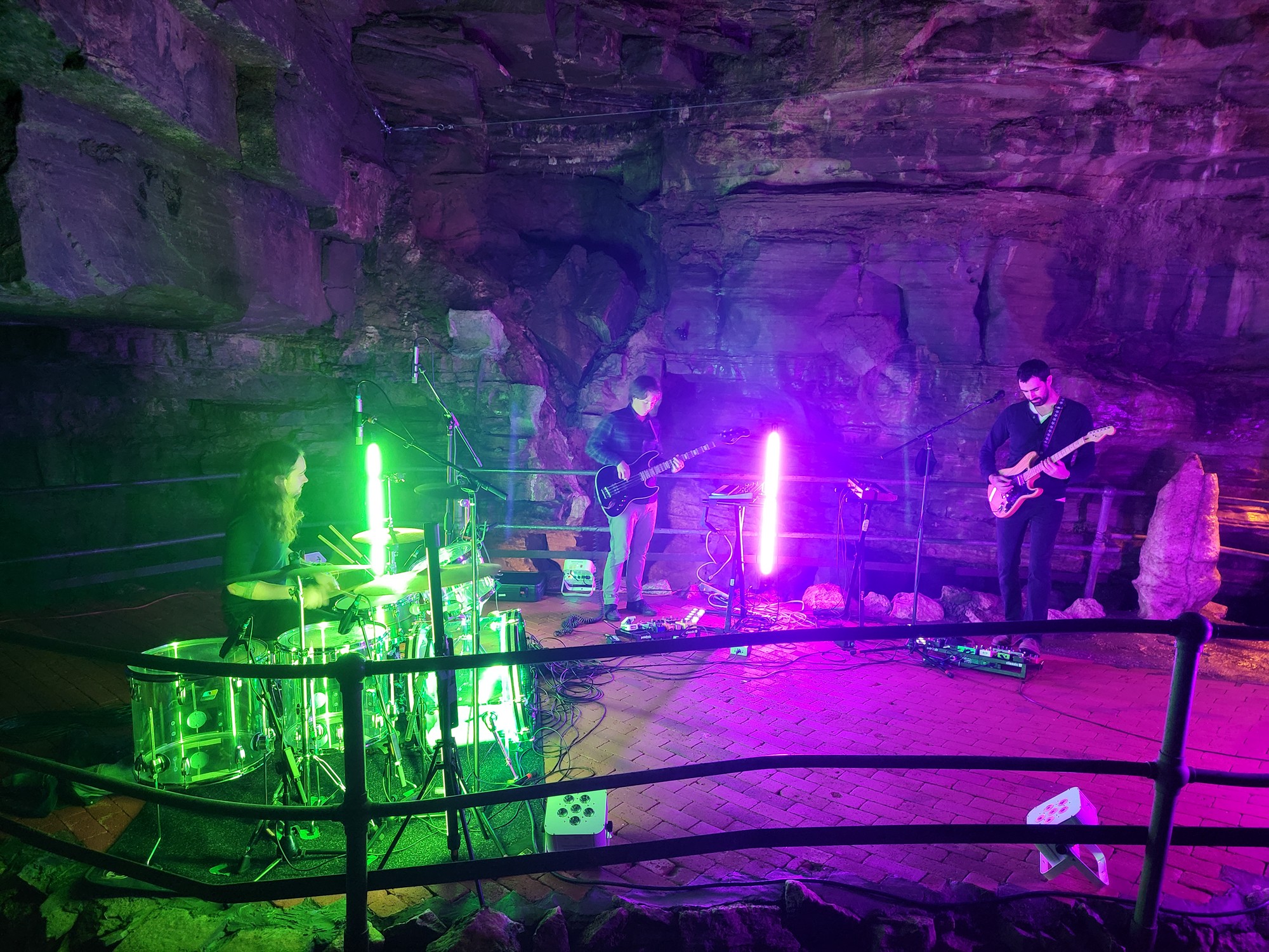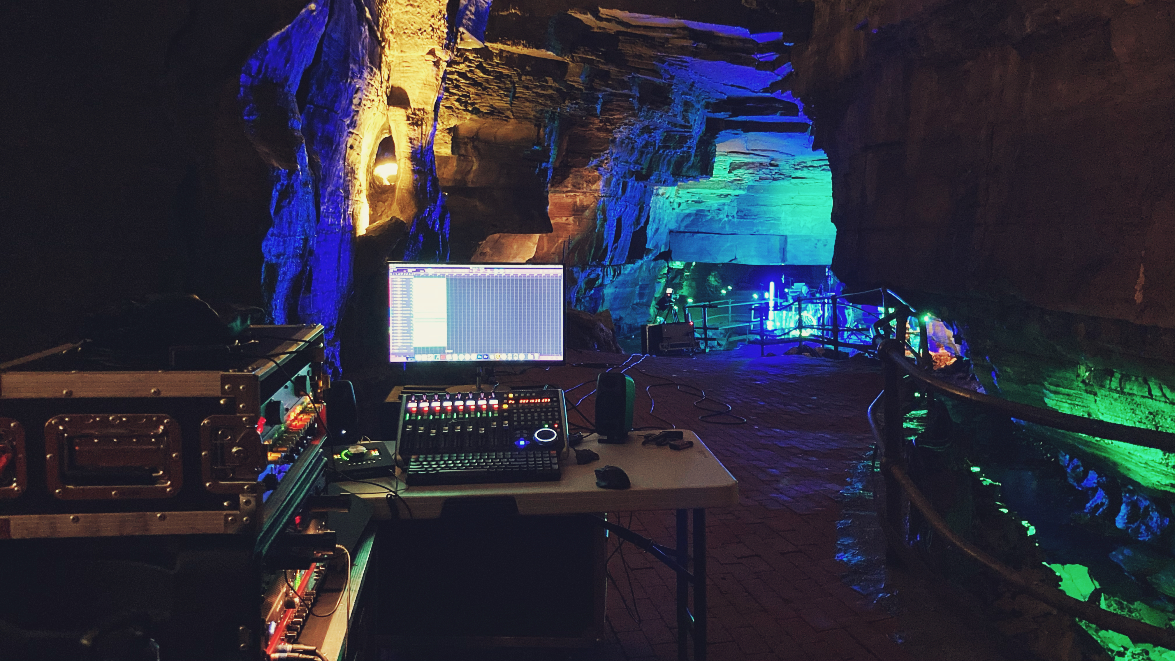 This wasn’t your standard studio setup. Every sound you hear on Acheron is shaped by the cavern itself. There are no artificial reverbs—just the pure, natural echoes of underground chambers carved out over thousands of years. We placed mics throughout the cave, capturing every resonance, every subtle reflection, letting the space dictate the sound. To top it off, we took an impulse response (IR) snapshot of the cavern’s acoustics, essentially turning it into a custom Howe Caverns reverb plugin—a one-of-a-kind tool I can now use in future mixes.