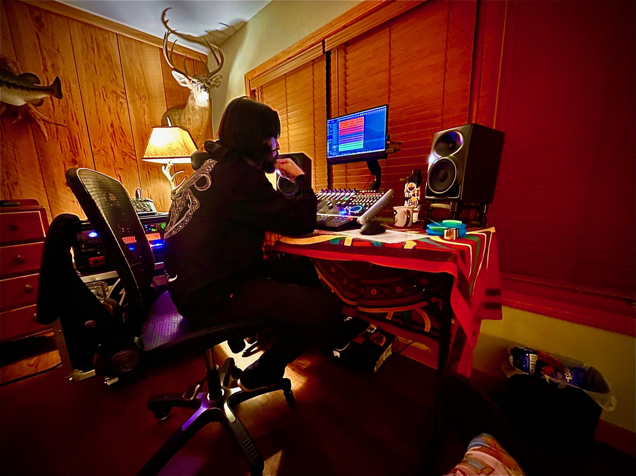 One of my biggest priorities was making sure we let the space itself become part of the record. Every reverb you hear on Reflections is the natural echo of that cabin. We leaned into the acoustics, shaping the sound around the environment instead of fighting against it. JR, as always, brought a ridiculous arsenal of guitars and amps, and together we explored every sonic possibility, pushing both our creativity and our gear to the limit.